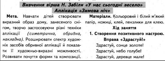Мета:Навчати дітей створювати виразний образ дому, занесеного снігом, творчо застосовуючи різні техніки аплікації (симетрична, обривна, накладна). Розширювати спектр художніх засобів обривної аплікації й показати її худньо-виразні можливості. Розвивати почуття форми та композиції.