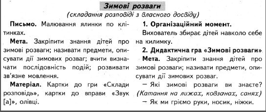 Мета: закріпити знання дітей про зимові розваги; називати предмети, описувати дії зимових розваг. вчити визначати послідовність подій; розвивати зв’язне мовлення.