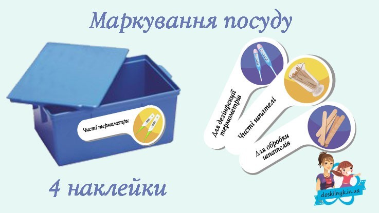До використання чисті шпателі та термометри повинні зберігатись у чистому сухому промаркованому посуді (“чисті термометри”, “чисті шпателі”). Після використання їх збирають у посуд з маркуванням “для дезінфекції термометрів”, “для обробки шпателів”.