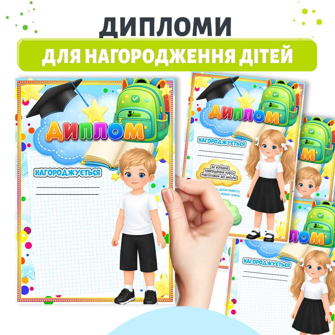 - Спеціально розроблені дипломи для хлопчика та дівчинки з текстом + пусті шаблони.
