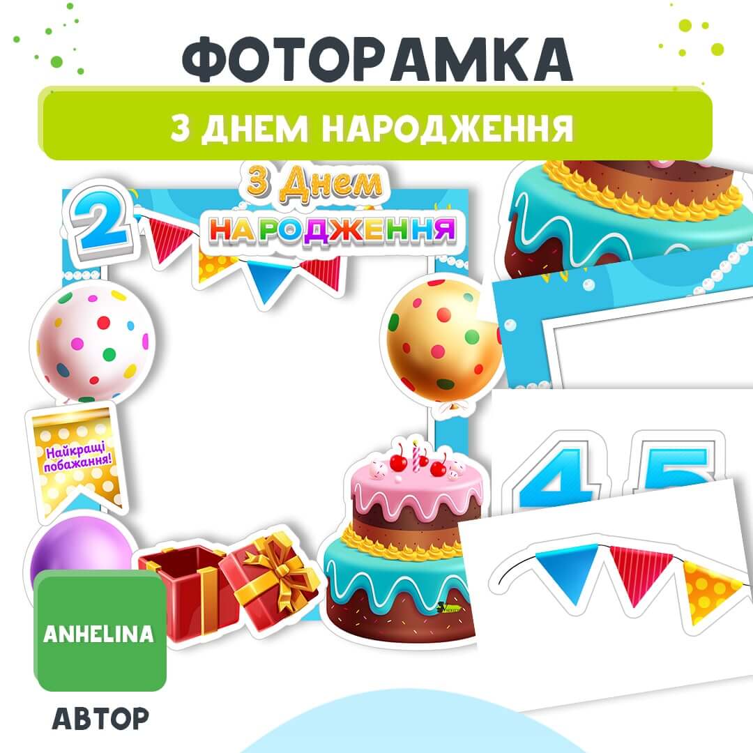Рамка, 8 елементів із зображенням предметів, надпис «День народження», цифри 2-9. Всього 20 аркушів до друку.