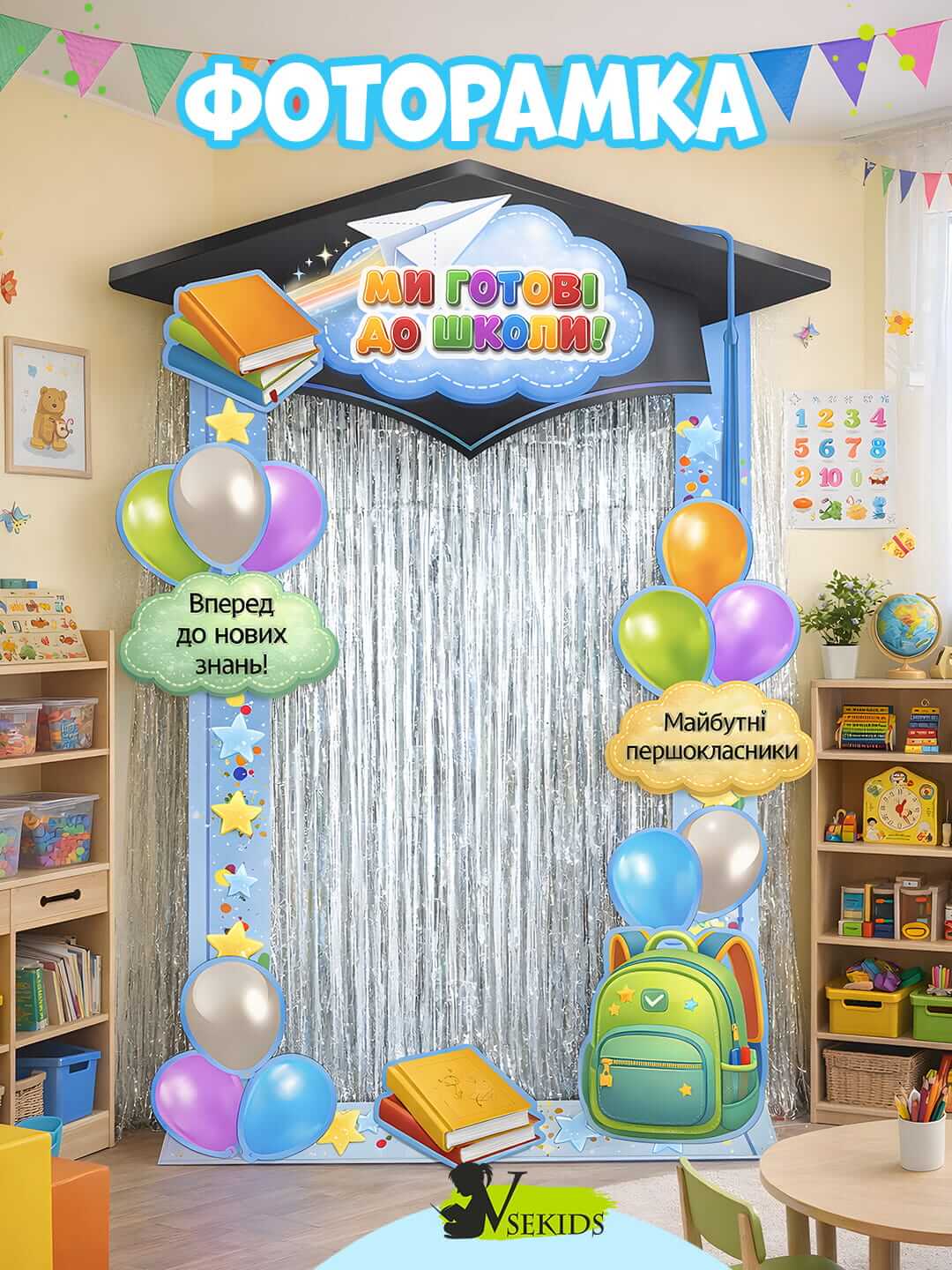 Створіть яскравий та пам’ятний куточок для фотографій на випускному святі. Підходить для свят, підсумкових заходів у дитячому садку та центрах підготовки до школи ⭐ Наш набір для оформлення фоторамки “Ми готові до школи” – це чудовий реквізит, який збереже щасливі посмішки дітей та їхніх батьків.