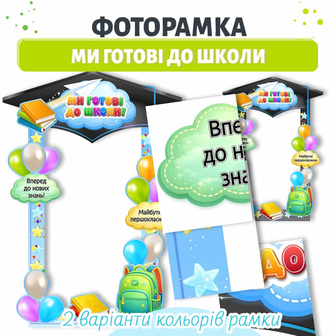 Рамка (чорна та блакитна, на ваш вибір), надписи 2 шт, повітряні кульки (5 кольорів), книги та портфель», що створять атмосферу урочистості. Розмір 148 см х 178 см. Всього 60 аркушів до друку.