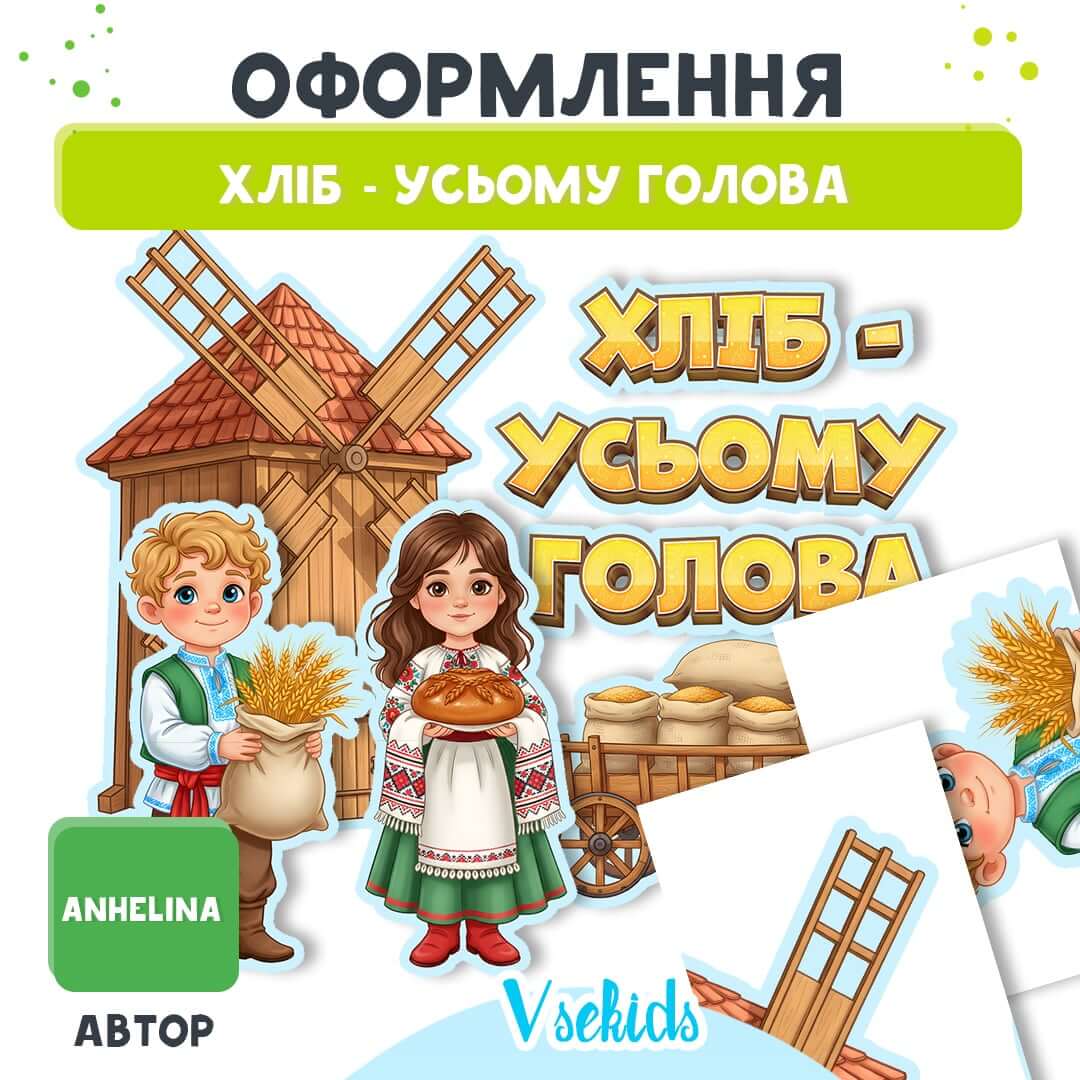 Наш набір «Хліб – усьому голова» — це чудовий матеріал для створення яскравого, затишного та пізнавального куточка у дитячому садку. Такий декор допоможе оформити стіну або тематичну дошку до Дня хліба, занять із праці, народознавства чи дитина в соціумі.