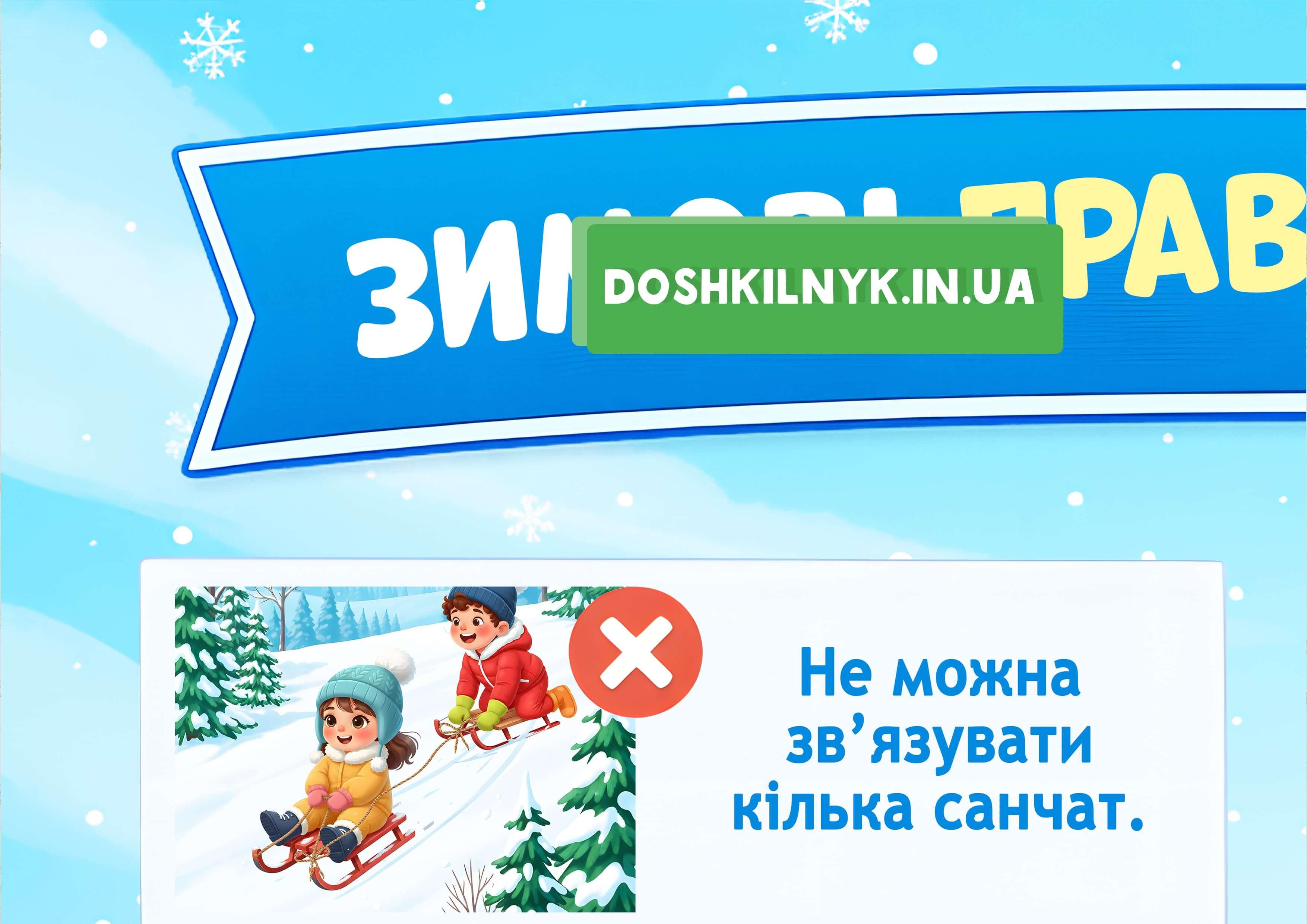 Навчальний плакат для дітей дошкільного віку, який у наочній формі допомагає закріпити основні правила безпечної поведінки взимку. Зрозумілі ілюстрації, позначки правильно / неправильно та короткі формулювання допомагають дітям легко запам’ятати важливі правила.