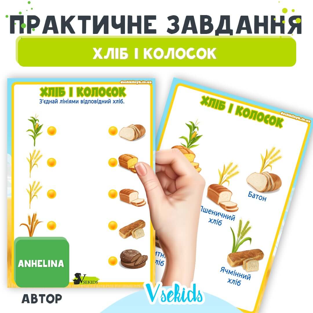 Цікаве практичне завдання для дошкільнят, яке допоможе ознайомити дітей з колосками різних хлібних злакових, закріпити знання про хліб. Завдання – з’єднати кожен колосок із хлібом за допомогою олівця.